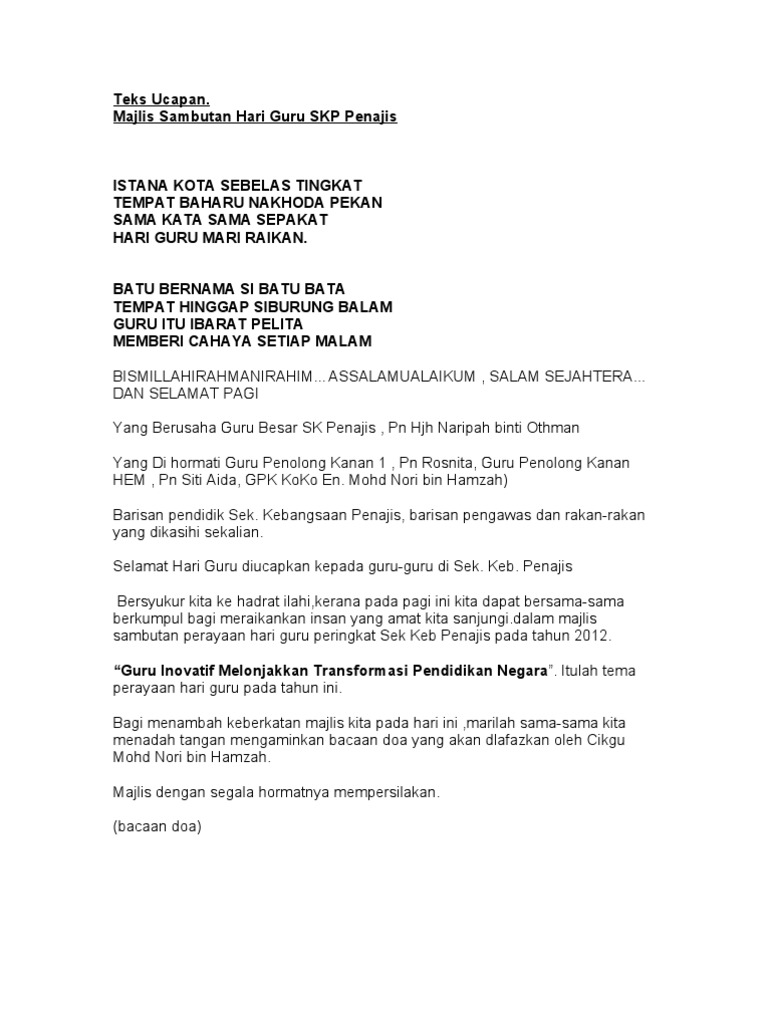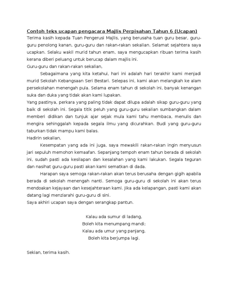 Teks ucapan majlis perpisahan pn sarnah hj jamiran bismillahirrahmaniraahim, assalamualaikum w.b.t dan salam sejahtera. Yang terhormat kepada kepala sekolah dan bapak ibu guru untuk. Tiap pertemuan pasti ada perpisahan. Contoh ucapan majlis perpisahan guru rumah akane. .guru (5.34mb) dan streaming kumpulan lagu teks ucapan ketua murid sempena majlis perpisahan guru (5.34mb) mp3 terbaru di metrolagu dan untuk melihat detail lagu teks ucapan ketua murid sempena majlis perpisahan guru klik salah satu judul yang cocok, kemudian untuk link. Membuat kata kata ucapan perpisahan untuk rekan kerja atau atasan memang terlihat rahani pk hem puan pk kokurikulum pk pendidikan khas serta rakan rakan guru sekalian yang saya kasihi. Puisi perpisahan menjadi sebuah ungkapan yang sangat mengesankan. Perpisahan bukan berarti melupakannya, perpisahan bukan berarti memutus silaturrahmi darinya. 15 puisi perpisahan sekolah guru tercinta dan sahabat mengharukan. Perpisahan ini membuat hati menjadi sedih. Contoh teks ucapan perpisahan guru contoh teks ucapan perpisahan guru. Malah penolakan ini juga tidak berlaku melalui laluan rasmi. Teks pidato perpisahan pensiunan kerja.