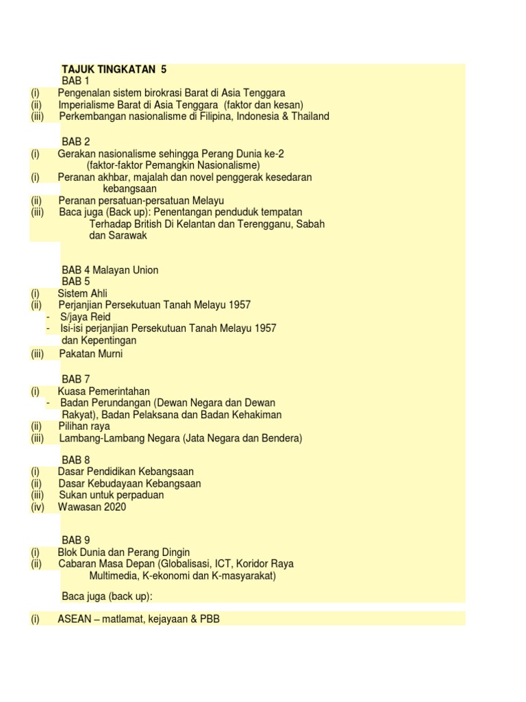 Download lagu sejarah tingkatan 5 bab 6 (4.2mb) dan streaming kumpulan lagu sejarah tingkatan 5 bab 6 (4.2mb) mp3 terbaru di metrolagu hasil diatas adalah hasil pencarian dari anda sejarah tingkatan 5 bab 6 mp3 dan menurut kami yang paling cocok adalah sejarah tingkatan 5. Nota ringkas sejarah tingkatan 5 bab 8 spm. Bab 1 | kemunculan dan perkembangan nasionalisme di asia tenggara bab 2. Pembinaan negara dan bangsa yang merdeka. Halang pahang, inderagiri dan kampar drp iii. Pembangunan dan perpaduan untuk kesejahteraan. Sejarah tingkatan 5 kertas 3 bab5. Kemunculan dan perkembangan nasionalisme di asia tenggara. • kawsan yang rakyatnya menerima dan memperakuai pemerintahan seorang raja. Bab 8 21.04.2012 · nota sejarah tingkatan 5 bab 8 1. ● parti rakyat brunei (prb) di bawah pimpinan a.m azhari menentang. Aplikasi sejarah spm tingkatan 5 ini dibuat bagi memudahkan para pelajar membuat ulangkaji dengan lebih interaktif dan efektif. Sejarah kertas 3 bab2 tingkatan 5.